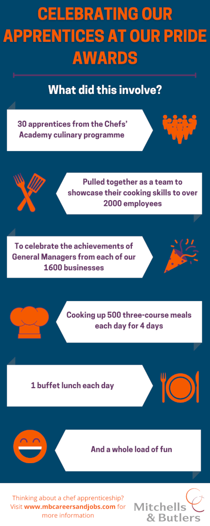 The apprentices cooked for the internal PRIDE Awards, which celebrates the achievements of General Managers from each of its 1600 businesses. Over the week, the apprentices cooked around 500 three-course meals each day for four days – that’s over 6000 plates of food in total! They also cooked a buffet lunch each day!